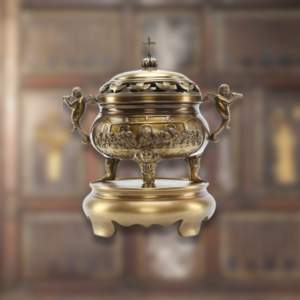 Lư hương có phần thân tròn tượng trưng cho sự viên mãn, phần nắp đục lỗ tạo luồng thoát khói trầm tự nhiên. Hai bên có tay cầm hình linh vật hoặc tượng thiên thần, mang ý nghĩa bảo hộ – dẫn dắt linh hồn.
