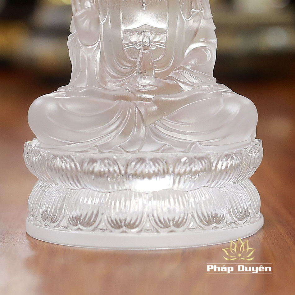 Tượng được chế tác từ lưu ly nguyên khối với độ trong suốt tự nhiên, ánh sáng xuyên qua tạo nên hiệu ứng lung linh huyền ảo. Lưu ly là chất liệu phong thủy mang ý nghĩa về sự thuần khiết, trí tuệ và ánh sáng của Phật pháp.